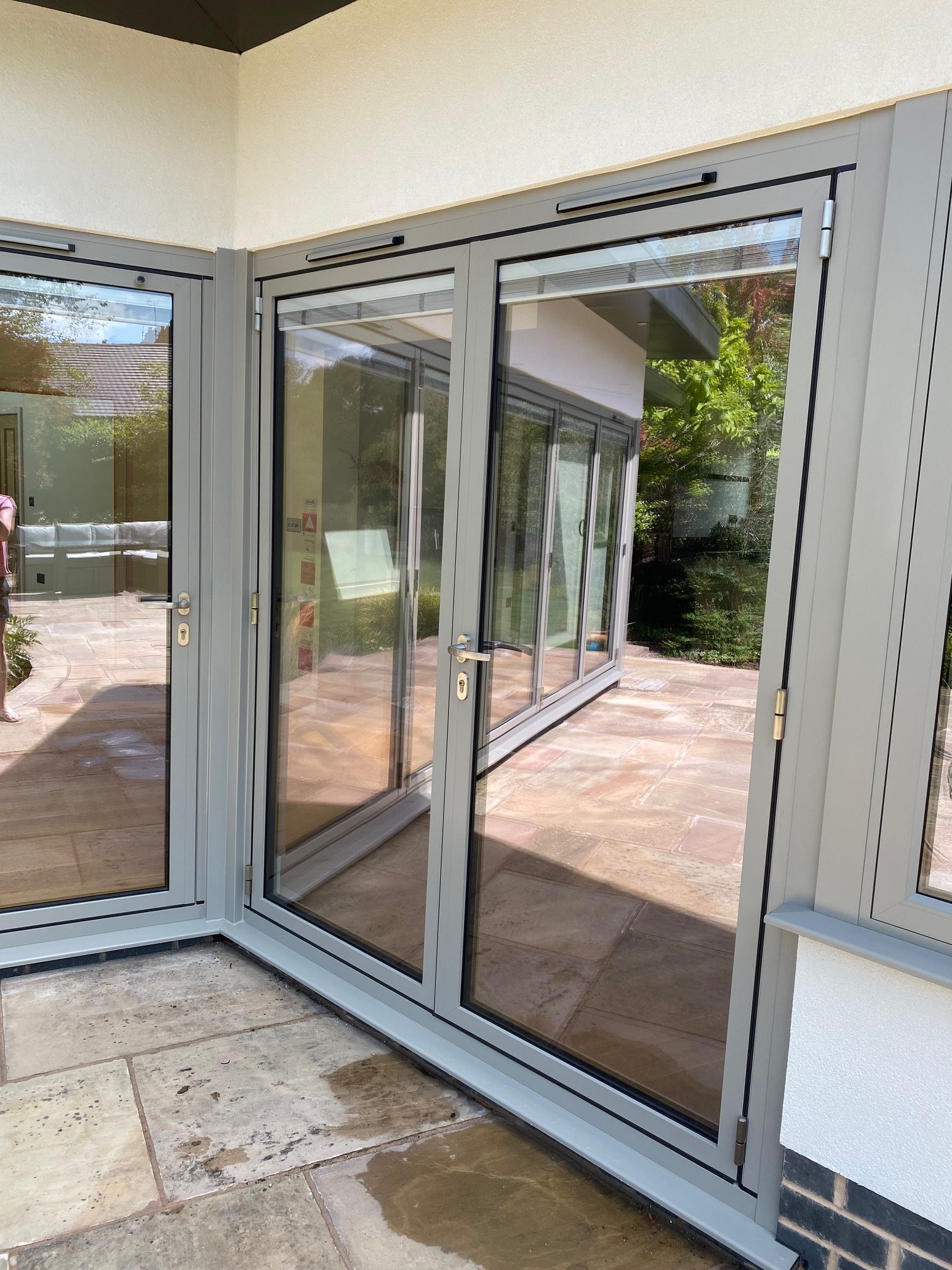 Leading onto the courtyard, the family wanted something modern, that made outdoor access easy, with views and natural light abundant. We installed Origin OB49 aluminium bifold doors in RAL 7030M grey, which the homeowner handpicked from our extensive colour chart, matching the windows that we will discuss later on.